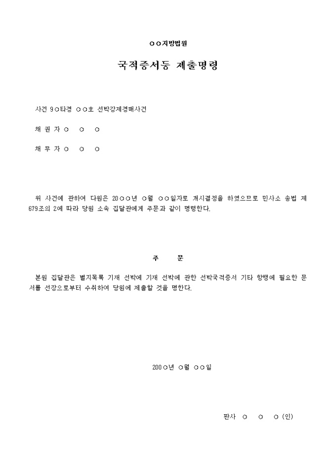 9,000원/월집달관에 대한 선박국적증서 등 제출명령서 입니다.