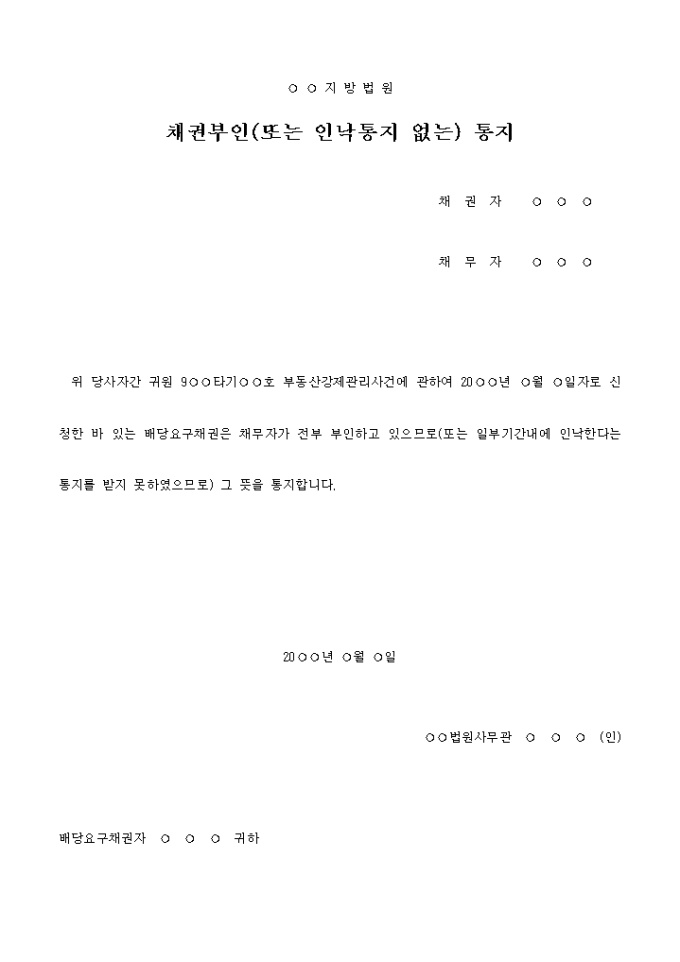 9,000원/월채권부인통지서 입니다. 위 당사자간 귀원 9○○타기○○호 부동산강제관리사건에 관하여 20○○년 ○월 ○일자로 신청한 바 있는 배당요구채권은 채무자가 전부 부인하고 있으므로(또는 일부기간내에 인낙한다는 통지를 받지 못하였으므로) 그 뜻을 통지합니다. ...