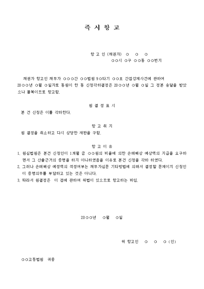 9,000원/월간접강제신청에 관한 재판에 대한 즉시항고장 입니다.