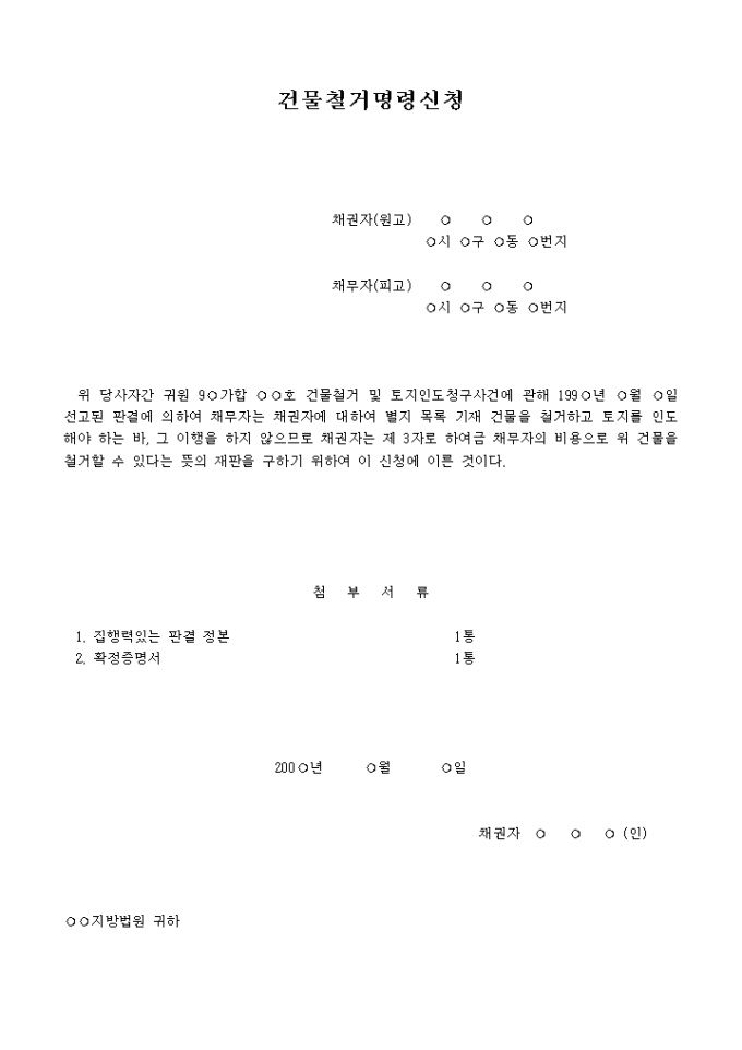 건물철거명령(수권결정)신청서(작위채권집행신청서) 입니다. 위 당사자간 귀원 9○가합 ○○호 건물철거 및 토지인도청구사건에 관해 199○년 ○월 ○일 선고된 판결에 의하여 채무자는 채권자에 대하여 별지 목록 기재 건물을 철거하고 토지를 인도해야 하는 바, 그 이행을 하지 않으므로 채권자는 제 3자로 하여 금 채무자의 비용으로 위 건물을 철거할 수 있다는 뜻의 재판을 구하기 위하여 이 신청에 이른 것이다. ...