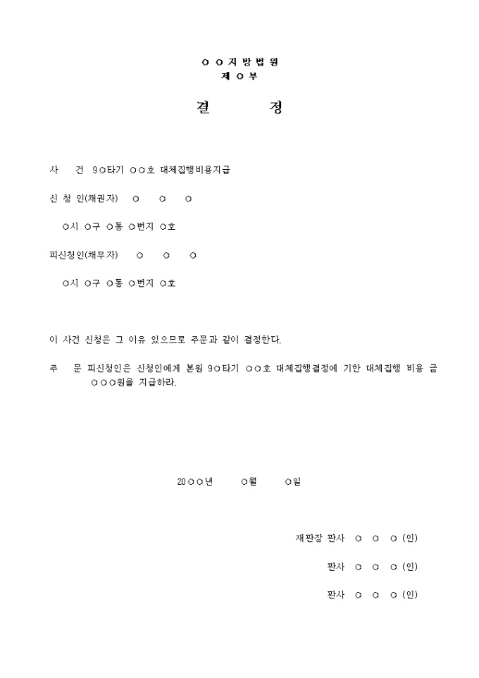 주 문 피신청인은 신청인에게 본원 9○타기 ○○호 대체집행결정에 기한 대체집행 비용 금 ○○○원을 지급하라.