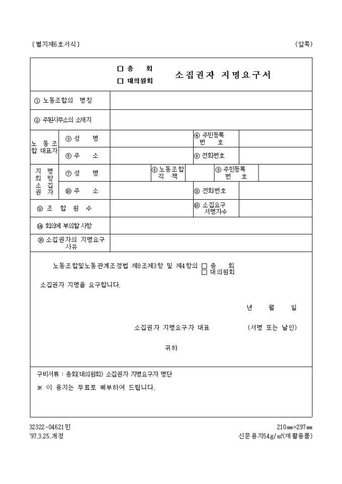 9,000원/월노동조합및노동관계조정법 제8조제3항 및 제4항의 (총회, 대의원회) 소집권자 지명을 요구할 때 사용하는 "(총회, 대의원회) 소집권자 지명요구서" 양식입니다.