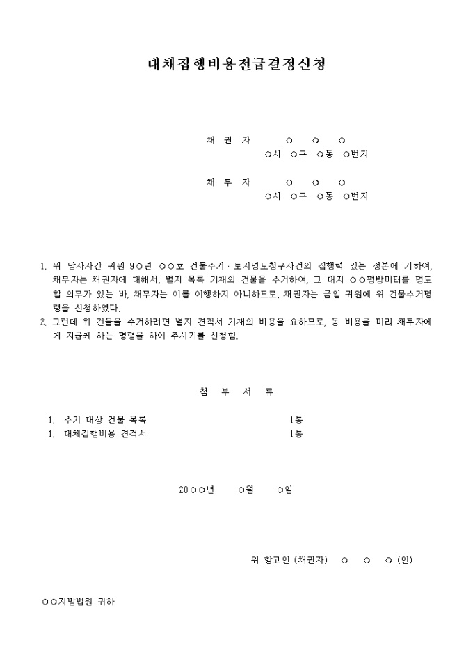 1. 위 당사자간 귀원 9○년 ○○호 건물수거․토지명도청구사건의 집행력 있는 정본에 기하여, 채무자는 채권자에 대해서, 별지 목록 기재의 건물을 수거하여, 그 대지 ○○평방미터를 명도할 의무가 있는 바, 채무자는 이를 이행하지 아니하므로, 채권자는 금일 귀원에 위 건물수거명령을 신청하였다.
