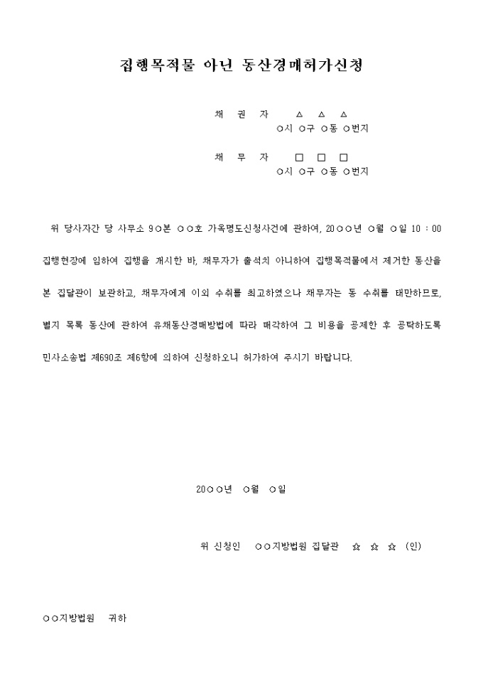 위 당사자간 당 사무소 9○본 ○○호 가옥명도신청사건에 관하여, 20○○년 ○월 ○일 10 : 00 집행현장에 임하여 집행을 개시한 바, 채무자가 출석치 아니하여 집행목적물에서 제거한 동산을 본 집달관이 보관하고, 채무자에게 이외 수취를 최고하였으나 채무자는 동 수취를 태만하므로, 별지 목록 동산에 관하여 유채동산경매방법에 따라 매각하여 그 비용을 공제한 후 공탁하도록 민사소송법 제690조 제6항에 의하여 신청하오니 허가하여 주시기 바랍니다.
