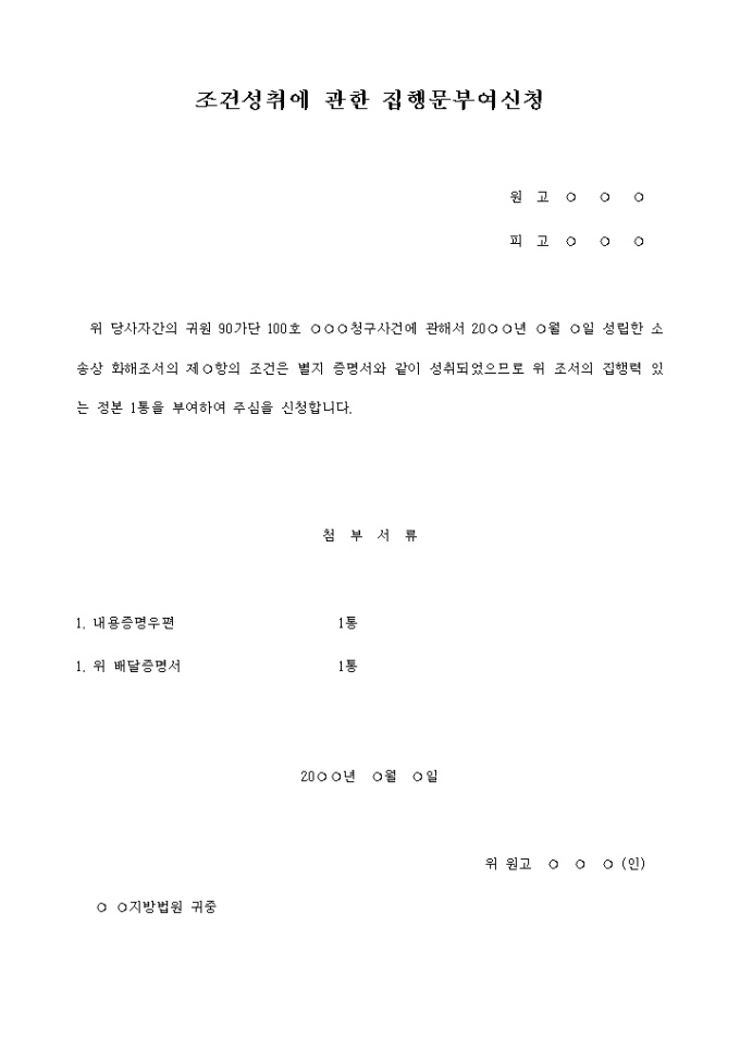 위 당사자간의 귀원 90가단 100호 ○○○청구사건에 관해서 20○○년 ○월 ○일 성립한 소송상 화해조서의 제○항의 조건은 별지 증명서와 같이 성취되었으므로 위 조서의 집행력 있는 정본 1통을 부여하여 주심을 신청합니다.