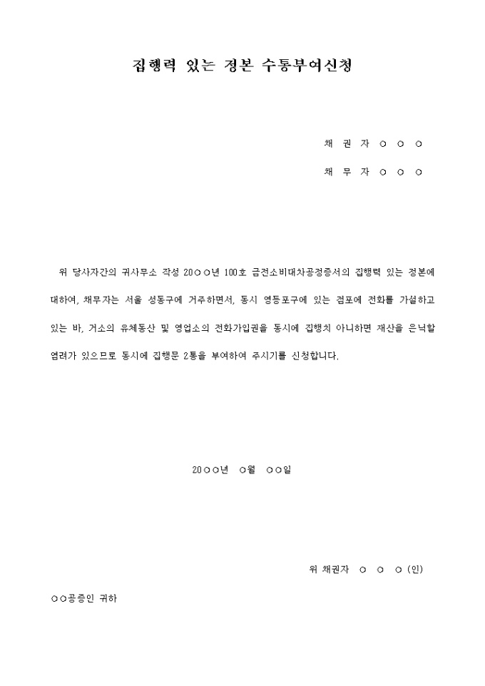 9,000원/월집행문수통부여신청서(공증인부여) 입니다. 위 당사자간의 귀사무소 작성 20○○년 100호 금전소비대차공정증서의 집행력 있는 정본에 대하여 , 채무자는 서울 성동구에 거주하면서, 동시 영등포구에 있는 점포에 전화를 가설하고 있는 바, 거소의 유체동산 및 영업소의 전화가입권을 동시에 집행치 아니하면 재산을 은닉할 염려가 있으므로 동시에 집행문 2통을 부여하여 주시기를 신청합니다. ...