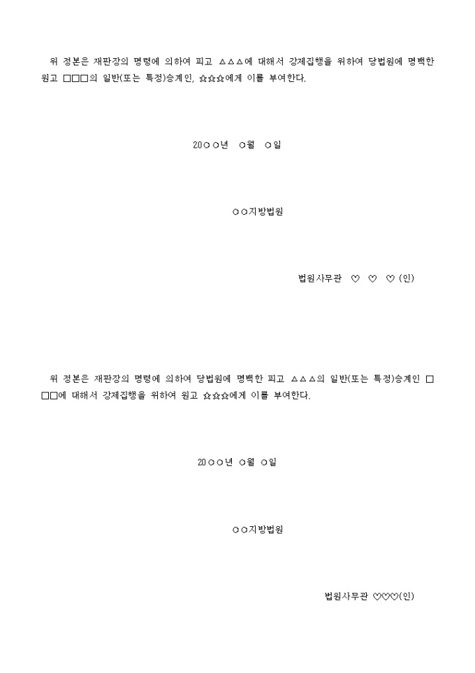 승계집행문(승계가법원에명백한경우) 입니다. 위 정본은 재판장의 명령에 의하여 당법원에 명백한 피고 △△△의 일반(또는 특정)승계인 □□□에 대해서 강제집행을 위하여 원고 ☆☆☆에게 이를 부여한다. ...