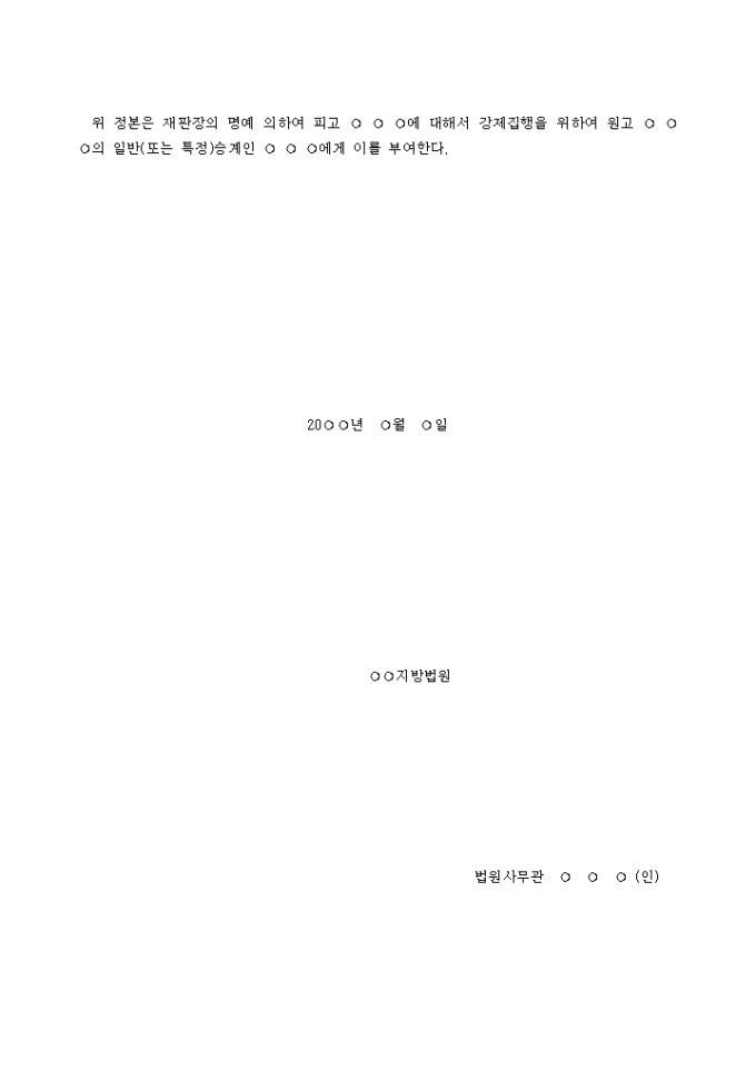 승계집행문(채권자승계) 입니다. 위 정본은 재판장의 명예 의하여 피고 ○ ○ ○에 대해서 강제집행을 위하여 원고 ○ ○ ○의 일반(또는 특정)승계인 ○ ○ ○에게 이를 부여한다. ...