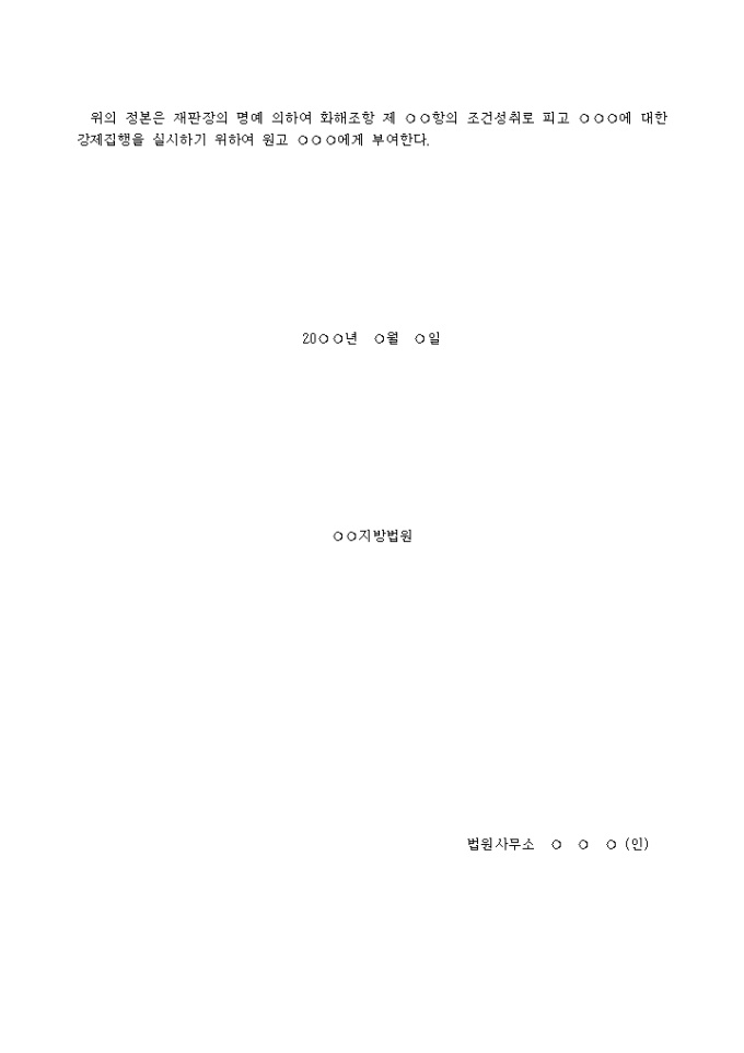 9,000원/월조건성취증명에따른집행문 입니다. 위의 정본은 재판장의 명예 의하여 화해조항 제 ○○항의 조건성취로 피고 ○○○에 대한 강제집행을 실시하기 위하여 원고 ○○○에게 부여한다. ...