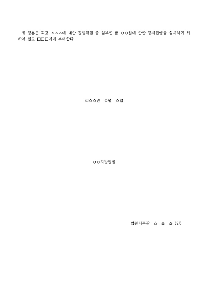 9,000원/월집행채권중일부집행문 입니다. 위 정본은 피고 △△△에 대한 집행채권 중 일부인 금 ○○원에 한한 강제집행을 실시하기 위하여 원고 □□□에게 부여한다 ...