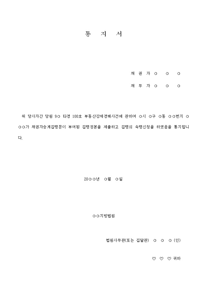 채권자승계인의집행속행신청통지서 입니다. 위 당사자간 당원 9○ 타경 100호 부동산강제경매사건에 관하여 ○시 ○구 ○동 ○○번지 ○○○가 채권자승계집행문이 부여된 집행정본을 제출하고 집행의 속행신청을 하였음을 통지합니다. ...