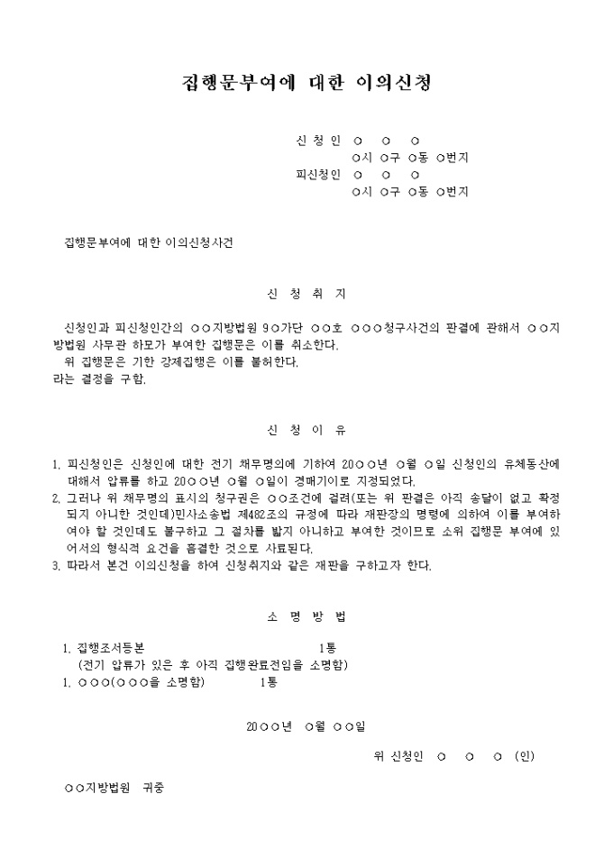 집행문부여거부처분에대한이의신청서(채무자신청서) 입니다.