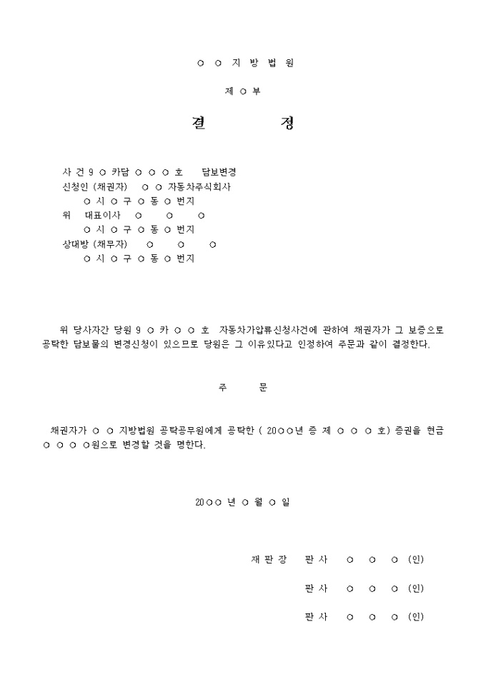 9,000원/월담보변경결정서 입니다. 위 당사자간 당원 9 ○ 카 ○ ○ 호 자동차가압류신청사건에 관하여 채권자가 그 보증으로 공탁한 담보물의 변경신청이 있으므로 당원은 그 이유있다고 인정하여 주문과 같이 결정한다. ...
