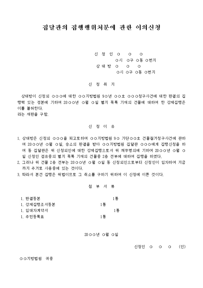 집달관의집행행위처분에대한이의신청서 예제 입니다.