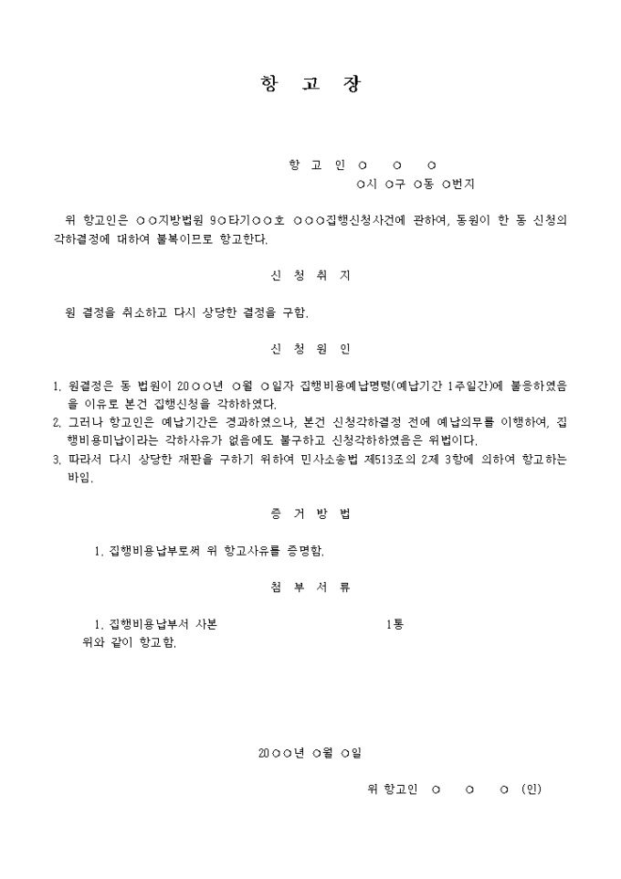 1. 원결정은 동 법원이 20○○년 ○월 ○일자 집행비용예납명령(예납기간 1주일간)에 불응하였음을 이유로 본건 집행신청을 각하하였다.