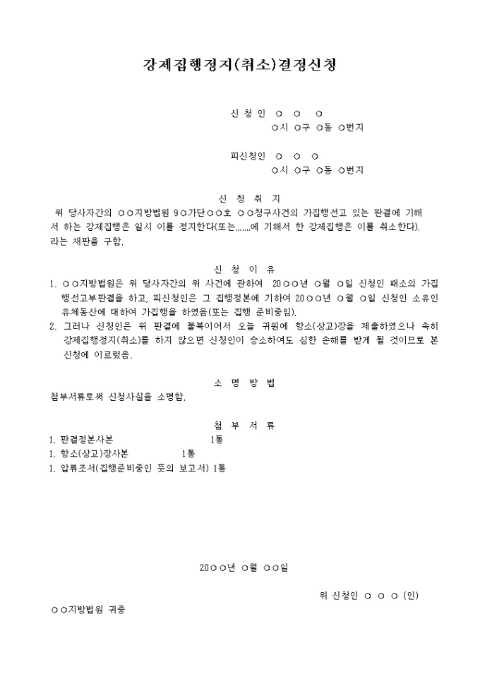 상소제기에기한집행정지(취소)신청서 입니다. 신 청 취 지 위 당사자간의 지방법원 9 가단 호 청구사건의 가집행선고 있는 판결에 기해 서 하는 강제집행은 일시 이를 정지한다(또는.......에 기해서 한 강제집행은 이를 취소한다). 라는 재판을 구함. 신 청 이 유 1. 지방법원은 위 당사자간의 위 사건에 관하여 20 년 월 일 신청인 패소의 가집행선고부판결을 하고, 피신청인은 그 집행정본에 기하여 20