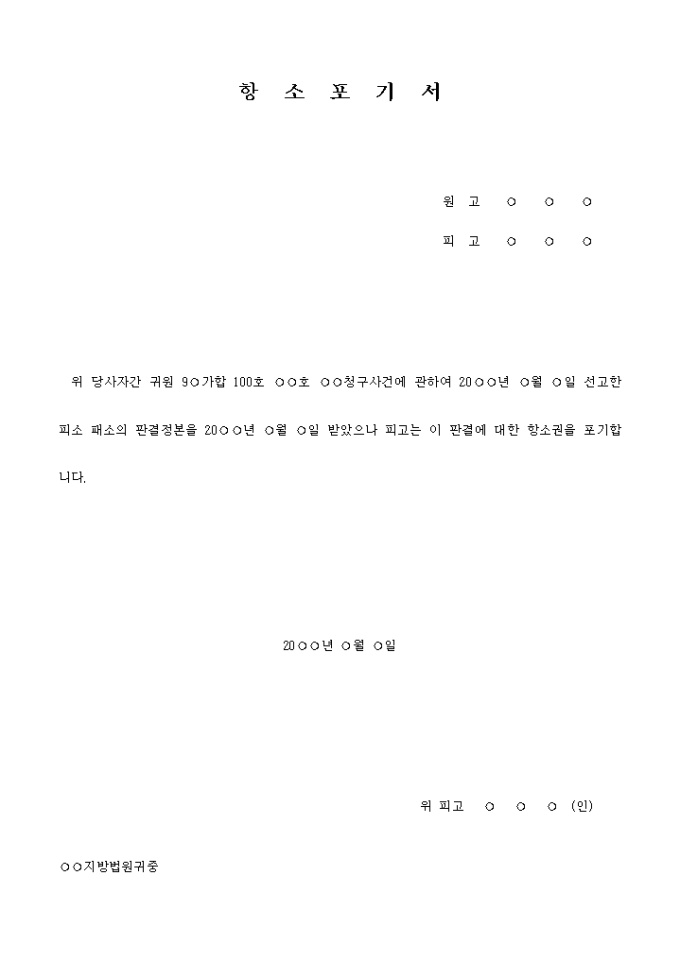 9,000원/월상소포기서 입니다. 위 당사자간 귀원 9○가합 100호 ○○호 ○○청구사건에 관하여 20○○년 ○월 ○일 선고한 피소 패소의 판결정본을 20○○년 ○월 ○일 받았으나 피고는 이 판결에 대한 항소권을 포기합니다. ...