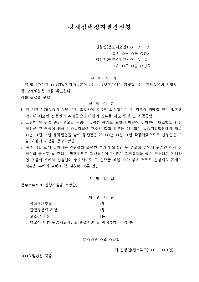 1. 위 판결은 20○○년 ○월 ○일 확정하여 원고인 피신청인은 위 판결의 집행력 있는 정본에 기하여 피고인 신청인의 유체동산에 대해서 압류를 하고 현재 그 속행중임.