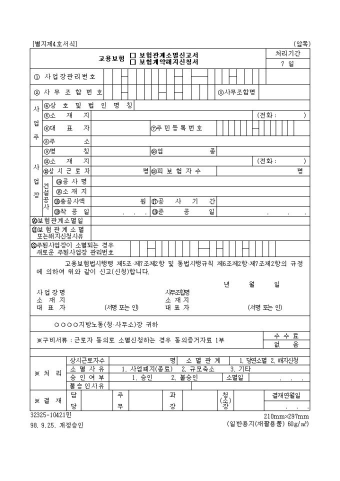 고용보험법시행령 제5조·제7조제2항 및 동법시행규칙 제6조제2항·제7조제2항의 규정에 고용보험 (보험관계 소멸신고, 보험계약 해지시)에 쓰이는 "고용보험 (보험관계 소멸신고서,보험계약 해지신청서) 양식입니다.