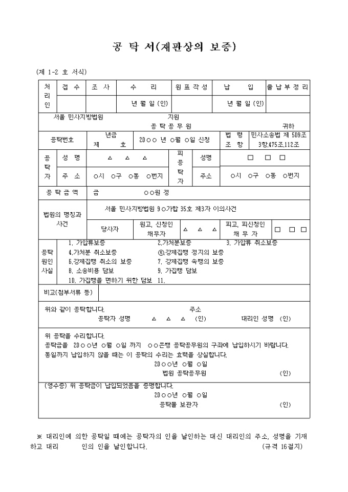 9,000원/월제3자이의소에기한강제집행정지보증공탁서(금전) 입니다. 1. 가압류보증 2.가처분보증 3. 가압류 취소보증 4.가처분 취소보증 ⑤.강제집행 정지의 보증 6.강제집행 취소의 보증 7. 강제집행 속행의 보증 8. 소송비용 담보 9. 가집행 담보 10. 가집행을 면하기 위한 담보 11. ...