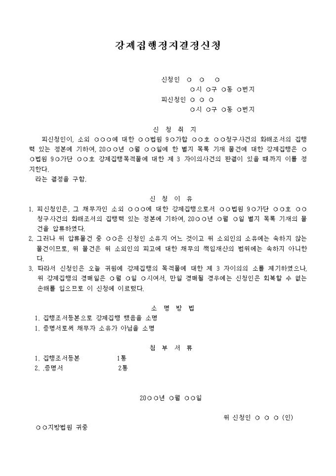 제3자이의소에기한강제집행정지신청서 입니다. 신 청 취 지 피신청인이, 소외 에 대한 법원 9 가합 호 청구사건의 화해조서의 집행력 있는 정본에 기하여 , 20 년 월 일에 한 별지 목록 기재 물건에 대한 강제집행은 법원 9 가단 호 강제집행목적물에 대한 제 3 자이의사건의 판결이 있을 때까지 이를 정지한다. 라는 결정을 구함. 신 청 이 유 1. 피신청인은, 그 채무자인 소외 에 대한 강제집