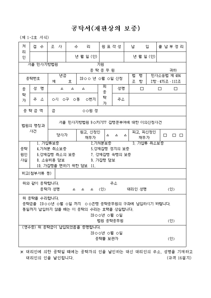 9,000원/월집행문부여신청서에기한강제집행일시정지보증공탁서(금전) 입니다. 서울 민사지방법원 9○카기77 집행문부여에 대한 이의신청사건 공탁금을 20○○년 ○월 ○일 까지 ○○은행 공탁공무원의 구좌에 납입하시기 바랍니다. 동일까지 납입하지 않을 때는 이 공탁의 수리는 효력을 상실합니다. ...