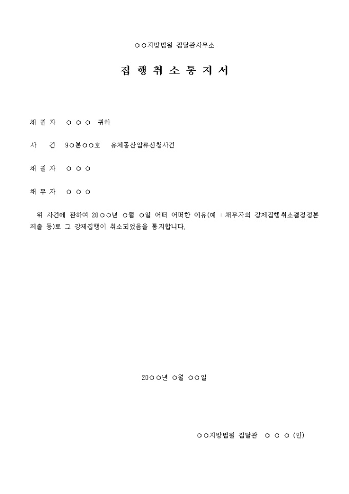 9,000원/월집행취소통지서(집달관) 입니다. 위 사건에 관하여 20○○년 ○월 ○일 어떠 어떠한 이유(예 : 채무자의 강제집행취소결정정본 제출 등)로 그 강제집행이 취소되었음을 통지합니다. ...
