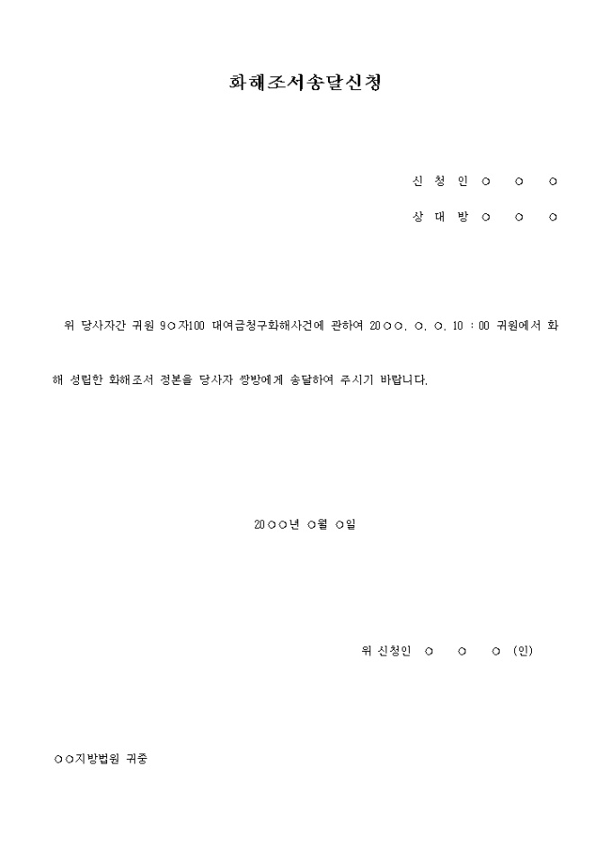 채무명의송달신청서 입니다. 위 당사자간 귀원 9○자100 대여금청구화해사건에 관하여 20○○. ○. ○. 10 : 00 귀원에서 화해 성립한 화해조서 정본을 당사자 쌍방에게 송달하여 주시기 바랍니다. ...