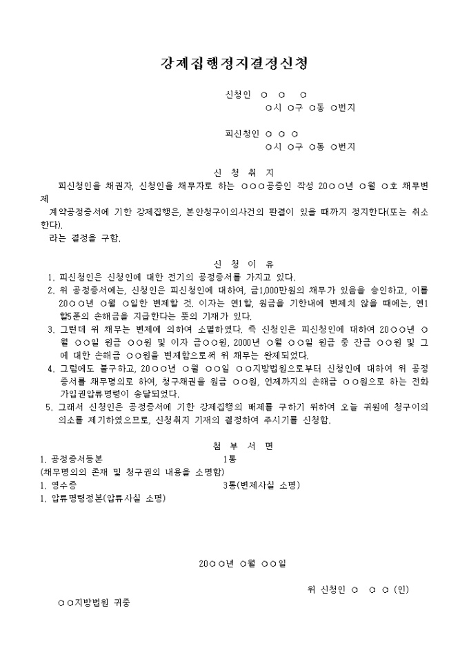 9,000원/월청구이의소에기한집행정지신청서(변제를원인으로 하는것) 예제 입니다. 신 청 취 지 피신청인을 채권자, 신청인을 채무자로 하는 공증인 작성 20 년 월 호 채무변제 계약공정증서에 기한 강제집행은, 본안청구이의사건의 판결이 있을 때까지 정지한다(또는 취소한다). 라는 결정을 구함. 신 청 이 유 1. 피신청인은 신청인에 대한 전기의 공정증서를 가지고 있다. 2. 위 공정증서에는, 신청인은 피신청인에 대하여 , 금1, 00