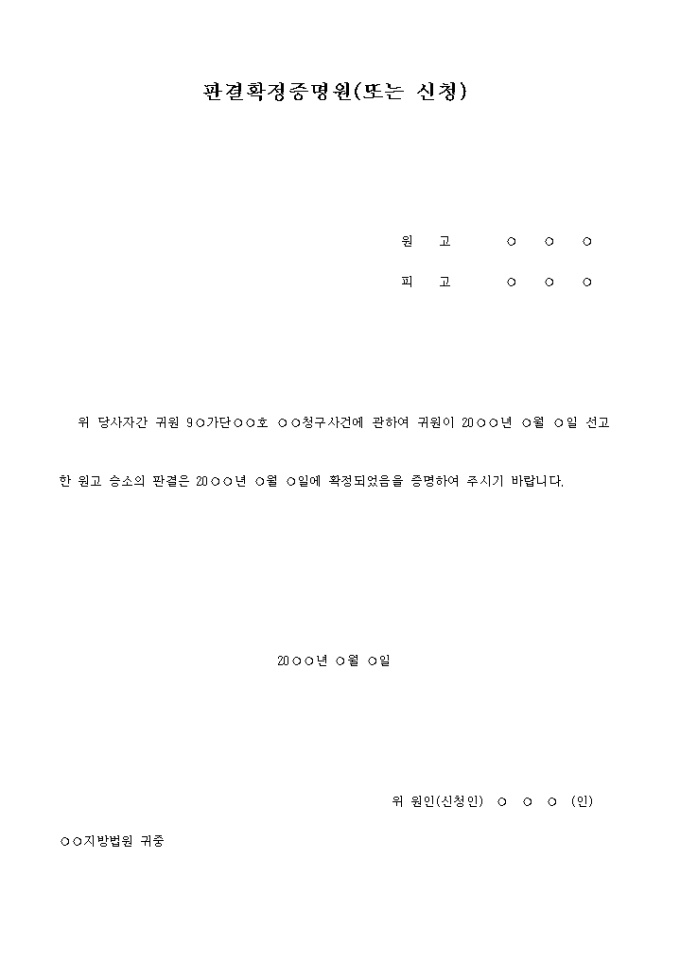 위 당사자간 귀원 9○가단○○호 ○○청구사건에 관하여 귀원이 20○○년 ○월 ○일 선고한 원고 승소의 판결은 20○○년 ○월 ○일에 확정되었음을 증명하여 주시기 바랍니다.