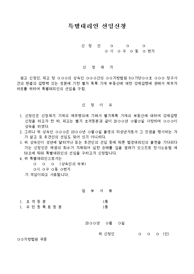 9,000원/월특별대리인선임신청서(집행신청전) 입니다. 신 청 취 지 원고 신청인, 피고 망 의 상속인 간의 지방법원 9 가단 호 청구사건의 판결의 집행력 있는 정본에 기한 별지 목록 기재 부동산에 대한 강제집행에 관해서 채무자 하모를 위하여 특별대리인의 선임을 구함. 신 청 이 유 1. 신청인은 신청취지 기재의 채무명의에 기해서 별지목록 기재의 부동산에 대하여 강제집행 신청을 하고자 한 바, 피
