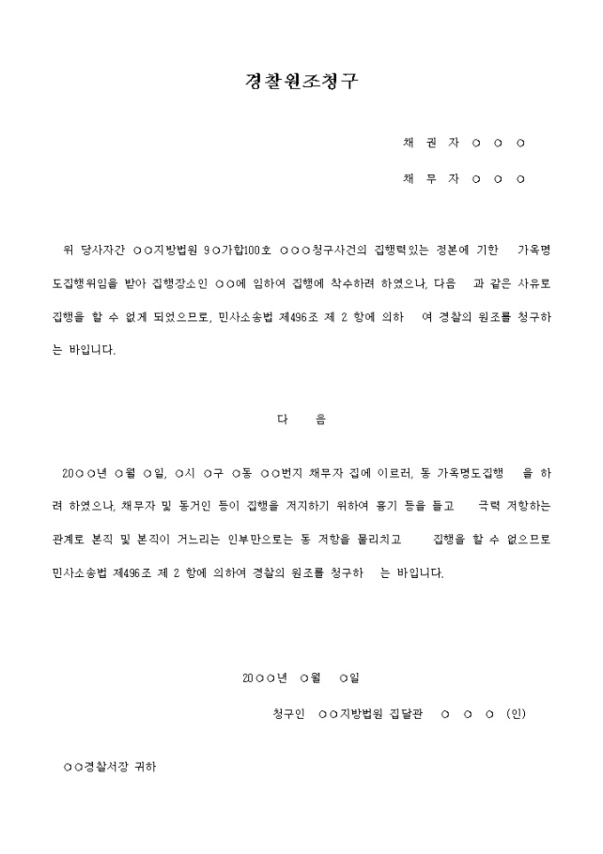 경찰원조청구서 입니다. 위 당사자간 ○○지방법원 9○가합100호 ○○○청구사건의 집행력있는 정본에 기한 가옥명도집행위임을 받아 집행장소인 ○○에 임하여 집행에 착수하려 하였으나 , 다음 과 같은 사유로 집행을 할 수 없게 되었으므로, 민사소송법 제496조 제 2 항에 의하 여 경찰의 원조를 청구하는 바입니다. ...