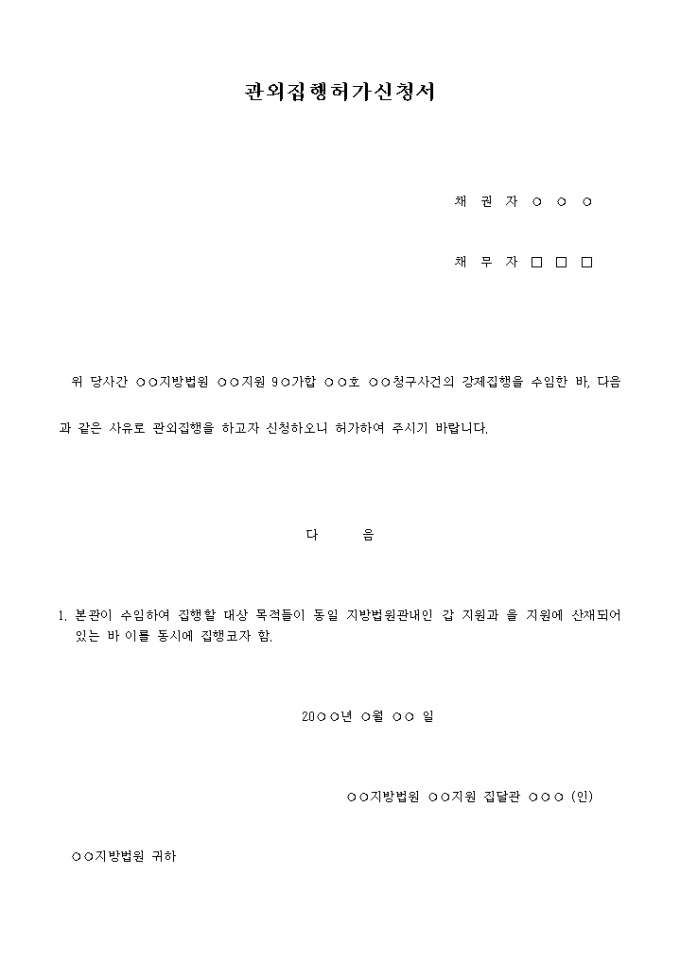 관외집행허가신청서 입니다. 위 당사간 ○○지방법원 ○○지원 9○가합 ○○호 ○○청구사건의 강제집행을 수임한 바, 다음과 같은 사유로 관외집행을 하고자 신청하오니 허가하여 주시기 바랍니다. , , , ,