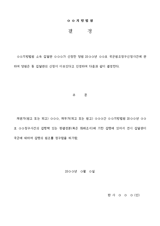 9,000원/월국군원조청구허가결정서 입니다. 주 문 채권자(원고 또는 피고) ○○○, 채무자(피고 또는 원고) ○○○간 ○○지방법원 20○○년 ○○호 ○○청구사건의 집행력 있는 판결정본(혹은 화해조서)에 기한 집행에 있어서 전시 집달관이 국군에 대하여 집행의 원조를 청구함을 허가함. ....