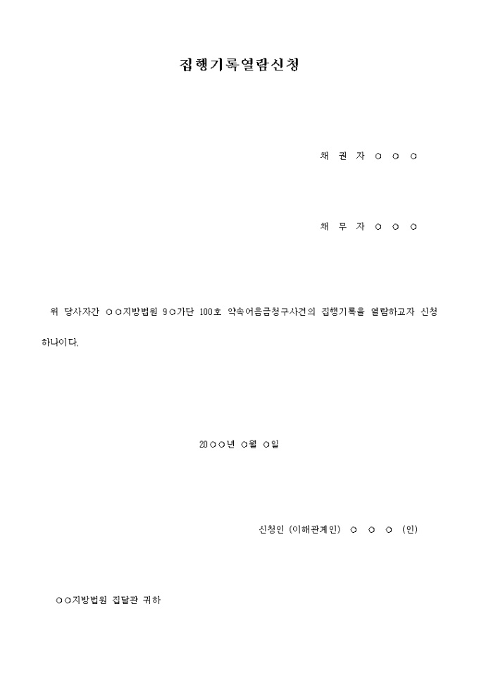 집행기록열람신청서 입니다. 위 당사자간 ○○지방법원 9○가단 100호 약속어음금청구사건의 집행기록을 열람하고자 신청하나이다. ....