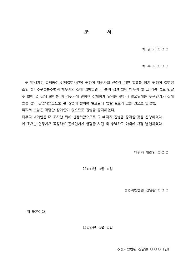 9,000원/월집행중지조서등본(허가신청첨부서류1) 입니다. 위 당사자간 유체동산 강제집행사건에 관하여 채권자의 신청에 기한 압류를 하기 위하여 집행장소인 시 구 동 번지 채무자의 집에 임하였던 바 문이 잠겨 있어 채무자 및 그 가족 등도 만날 수 없어 옆 집에 물어본 바 거주자에 관하여 상세하게 알지는 못하나 일요일에는 누구인가가 집에 있는 것이 판명되었으므로 본 집행에 관하여 일요일에 임할 필요가 있는 것으로 인정됨. ...