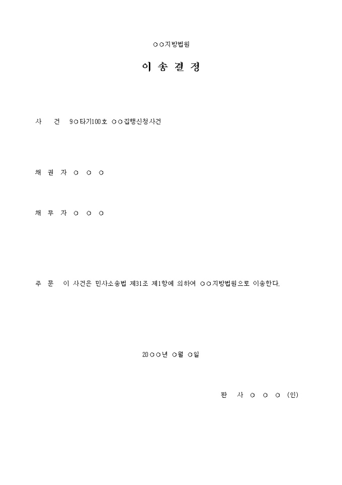 집행법원의이송결정서 입니다. 사 건 9○타기100호 ○○집행신청사건 채 권 자 ○ ○ ○ 채 무 자 ○ ○ ○ 주 문 이 사건은 민사소송법 제31조 제1항에 의하여 ○○지방법원으로 이송한다. ...