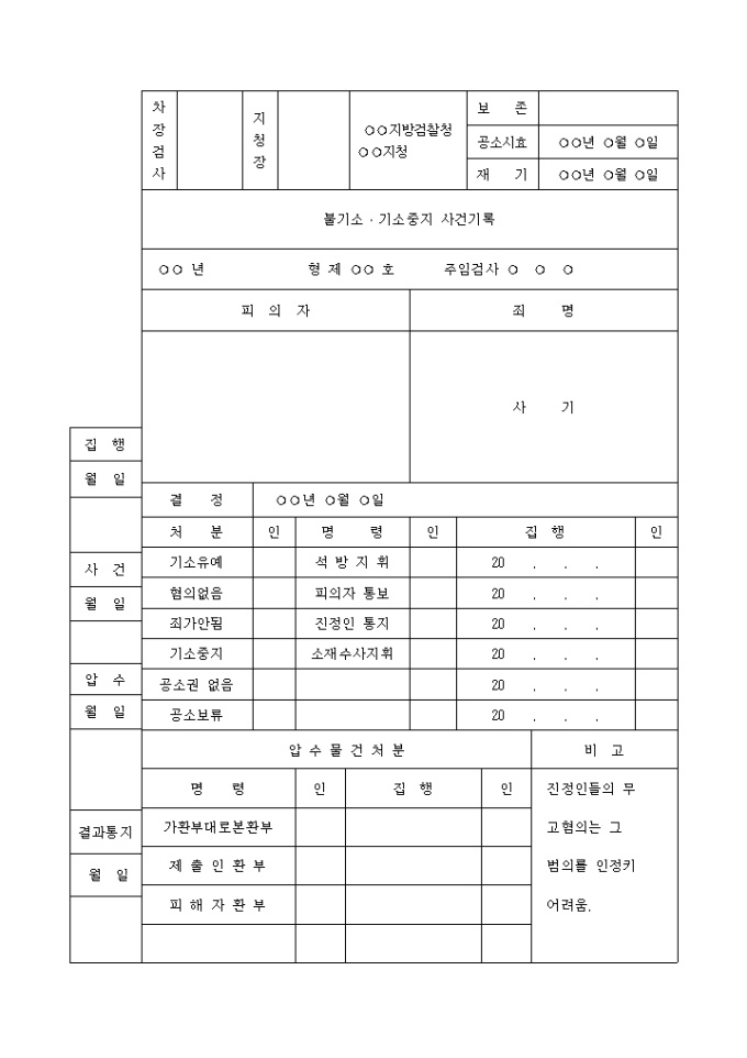 불기소 기소중지 사건기록 입니다. ○○ 년 형 제 ○○ 호 주임검사 ○ ○ ○ 죄 명 : 사 기 진정인들의 무 고혐의는 그 범의를 인정키 어려움.