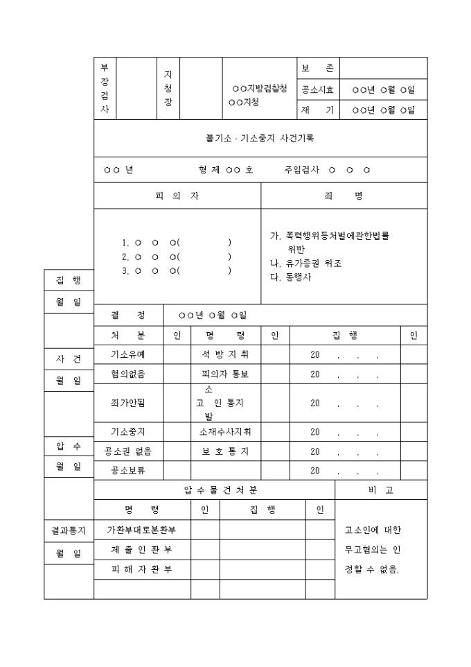 9,000원/월불기소결정서(혐의없음)(5) 입니다. ○○ 년 형 제 ○○ 호 주임검사 ○ ○ ○ [죄 명] 가. 폭력행위등처벌에 관한 법률 위반 나. 유가증권 위조 다. 동행사 고소인에 대한 무고혐의는 인정할 수 없음. ...