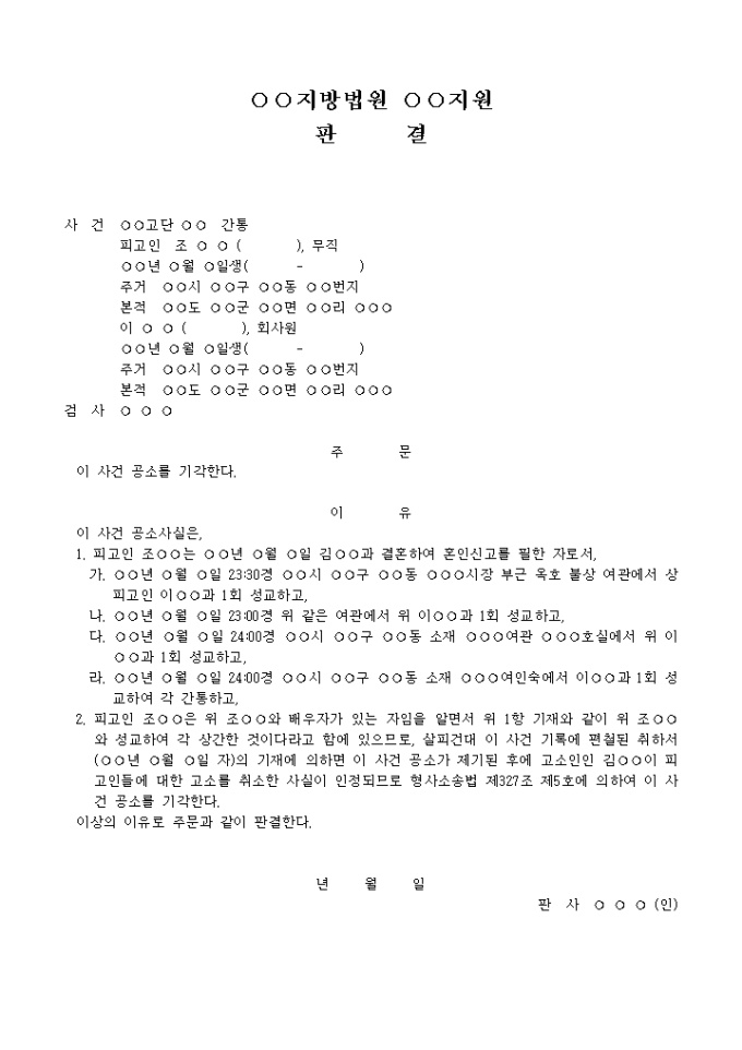 9,000원/월판결문(간통→공소기각) 입니다. 주 문 이 사건 공소를 기각한다. 이 유 이 사건 공소사실은, 1. 피고인 조○○는 ○○년 ○월 ○일 김○○과 결혼하여 혼인신고를 필한 자로서, 가. ○○년 ○월 ○일 23:30경 ○○시 ○○구 ○○동 ○○○시장 부근 옥호 불상 여관에서 상 피고인 이○○과 1회 성교하고, ...