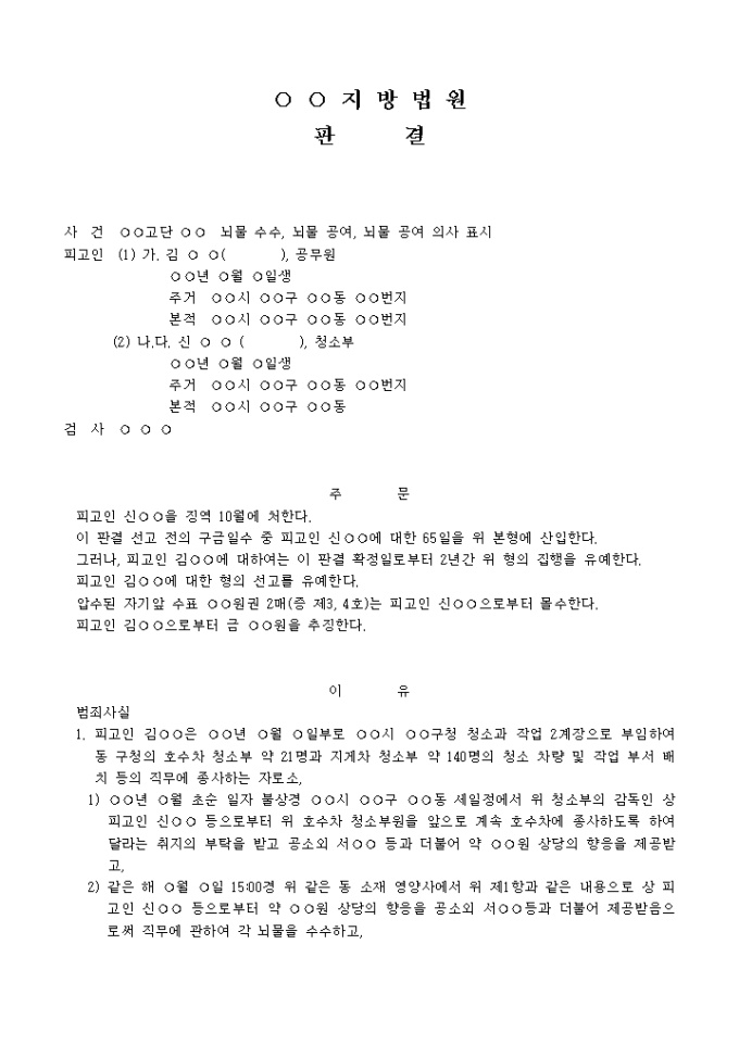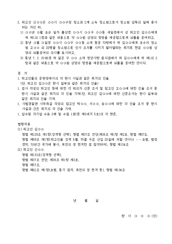 판결문(뇌물수수등→선고유예) 예제 입니다. 주 문 피고인 신○○을 징역 10월에 처한다. 이 판결 선고 전의 구금일수 중 피고인 신○○에 대한 65일을 위 본형에 산입한다. 그러나, 피고인 김○○에 대하여 는 이 판결 확정일로부터 2년간 위 형의 집행을 유예한다. 피고인 김○○에 대한 형의 선고를 유예한다. 압수된 자기앞 수표 ○○원권 2매(증 제3, 4호)는 피고인 신○○으로 부터 몰수한다. 피고인 김○○으로 부터 금 ○○원을 추