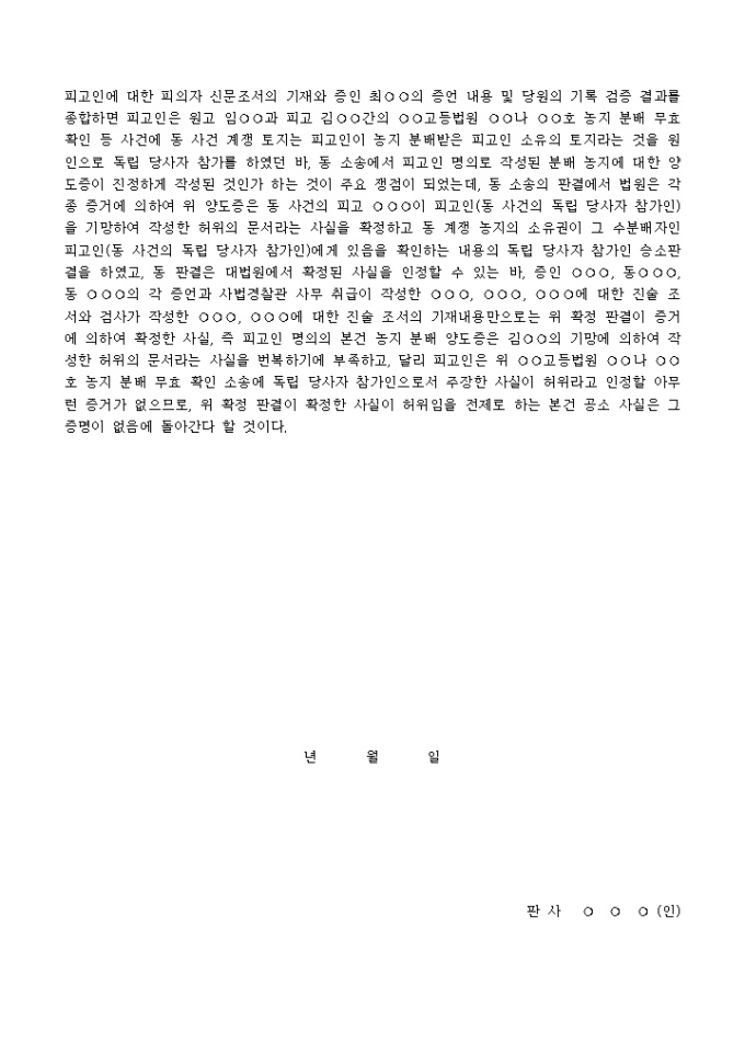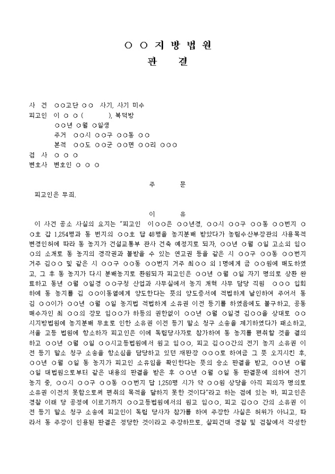 9,000원/월판결문(사기→무죄)-1 예제 입니다. 주 문 피고인은 무죄. 이 유 이 사건 공소 사실의 요지는 “피고인 이○○은 ○○년경, ○○시 ○○구 ○○동 ○○번지 ○○호 갑 1, 254평과 동 번지의 ○○호 답 48평을 농지분배 받았다가 농림수산부장관의 사용목적 변경인허에 따라 동 농지가 건설교통부 관사 건축 예정지로 되자, ○○년 ○월 ○일 고소외 임○○의 소개로 동 농지의 경작권과 불받을 수 있는 연고권 등을 같은 시