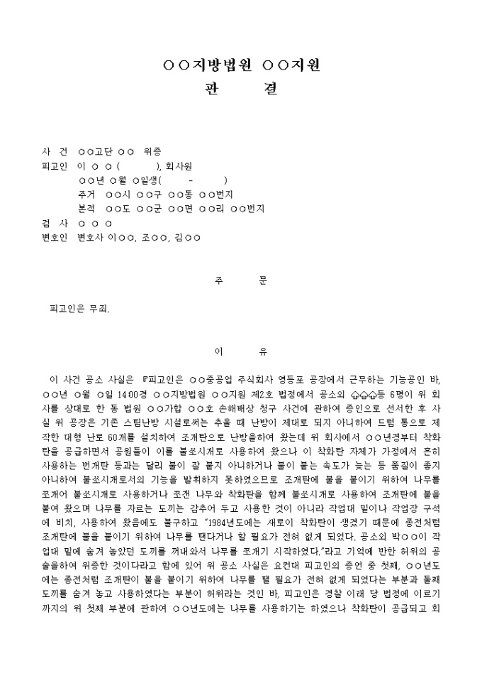 판결문(위증→무죄) 예제 입니다. 주 문 피고인은 무죄. 이 유 이 사건 공소 사실은 『피고인은 중공업 주식회사 영등포 공장에서 근무하는 기능공인 바, 년 월 일 14:00경 지방법원 지원 제2호 법정에서 공소외 ♤♤♤등 6명이 위 회사를 상대로 한 동 법원 가합 호 손해배상 청구 사건에 관하여 증인으로 선서한 후 사실 위 공장은 기존 스팀난방 시설로써는 추울 때 난방이 제대로 되