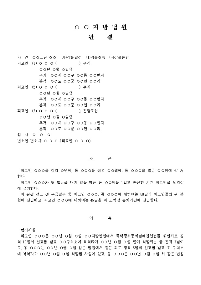 9,000원/월판결문(장물알선등→징역등) 예제 입니다. 주 문 피고인 ○○○을 징역 ○년에, 동 ○○○을 징역 ○○월에, 동 ○○○을 벌금 ○○원에 각 처한다. 피고인 ○○○가 위 벌금을 내지 않을 때는 돈 ○○원을 1일로 환산한 기간 피고인을 노역장에 유치한다. 이 판결 선고 전 구금일수 중 피고인 ○○○, 동 ○○○에 대하여 는 60일씩 피고인들의 위 본형에 산입하고, 피고인 ○○○에 대하여 는 45일을 위 노역장 유치기간에 산입한다.