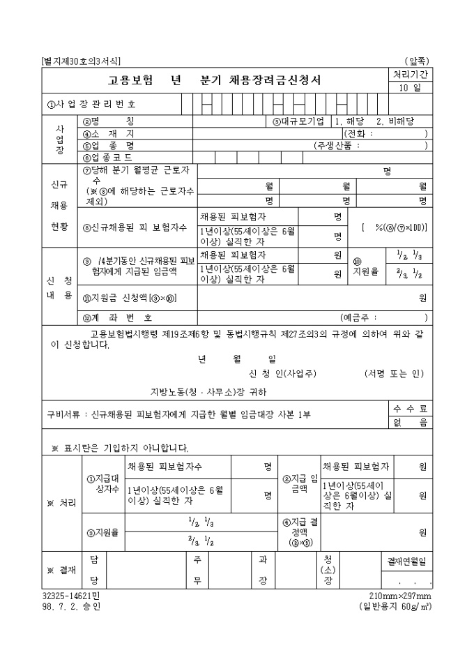 고용보험법시행령 제19조제6항 및 동법시행규칙 제27조의3의 규정에 의하여 고용보험 년 분기 채용장려금 신청을 하고자 할 때 사용되는 "고용보험 년 분기 채용 장려금 신청서" 양식입니다.