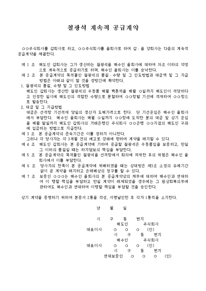 제 1 조 매도인 갑회사는 그가 생산하는 철광석을 매수인 을회사에 대하여 차조 이하의 약정으로 계속적으로 공급하기로 하며, 매수인 을회사는 이를 승낙한다.