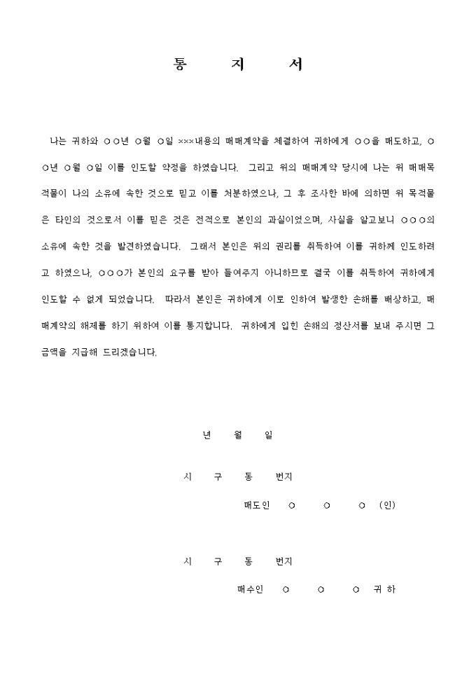 9,000원/월계약해제 통지서(타인의 물건매매) 입니다.