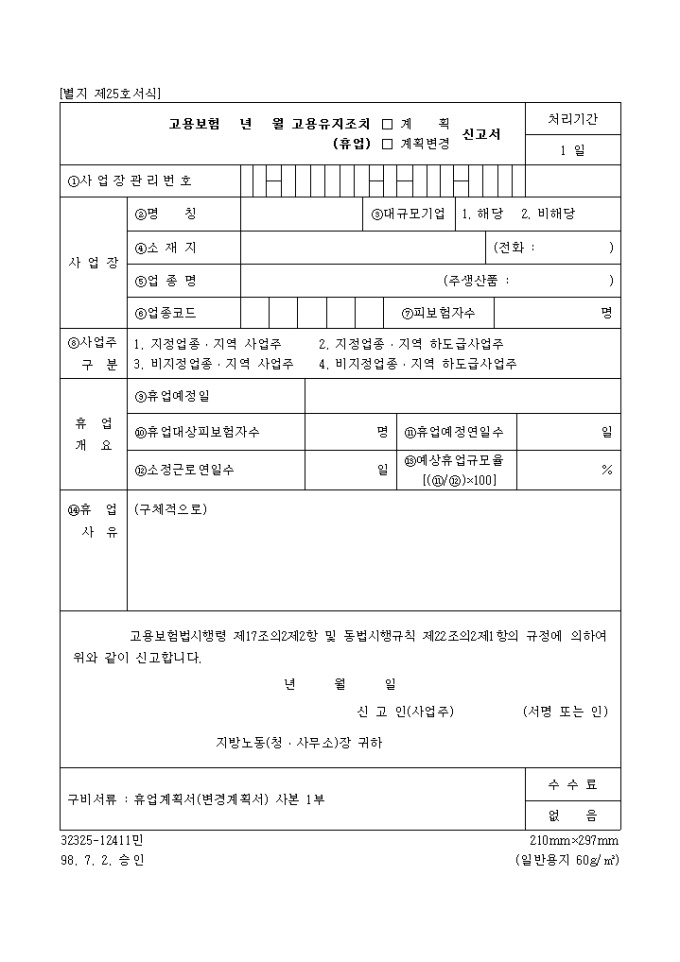 9,000원/월고용보험법시행령 제17조의2제2항 및 동법시행규칙 제22조의2제1항의 규정에 의하여 고용보험 년 월 고용유지 조치, 휴업(계획,계획변경)신고시에 사용되는 "고용보험 년 월 고용유지 조치, 휴업(계획,계획변경)신고서" 양식입니다.