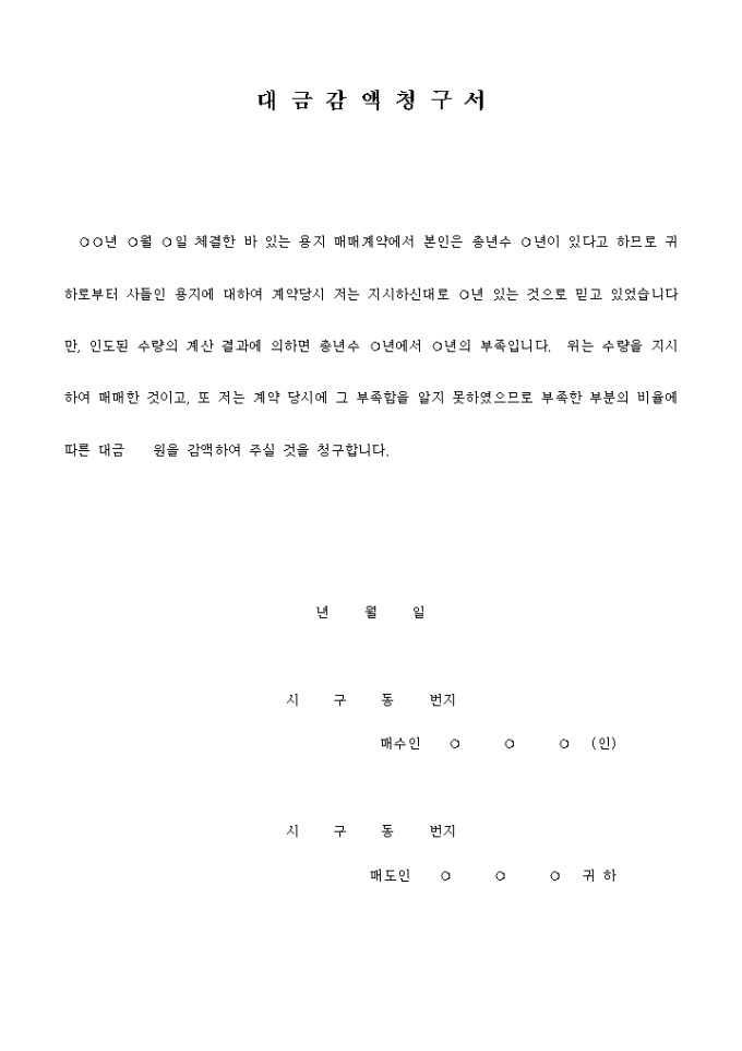 ○○년 ○월 ○일 체결한 바 있는 용지 매매계약에서 본인은 총년수 ○년이 있다고 하므로 귀하로부터 사들인 용지에 대하여 계약당시 저는 지시하신대로 ○년 있는 것으로 믿고 있었습니다만, 인도된 수량의 계산 결과에 의하면 총년수 ○년에서 ○년의 부족입니다