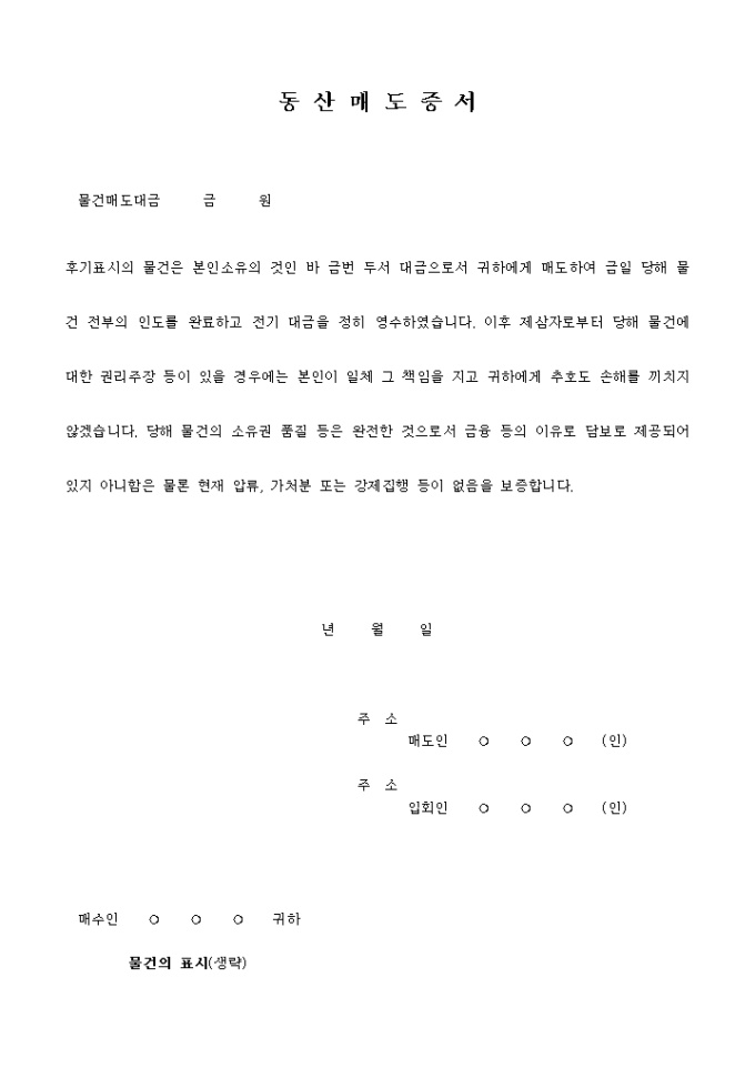 9,000원/월동산매도증서 예제 입니다. 물건매도대금 금 원 후기표시의 물건은 본인소유의 것인 바 금번 두서 대금으로서 귀하에게 매도하여 금일 당해 물건 전부의 인도를 완료하고 전기 대금을 정히 영수하였습니다. 이후 제삼자로부터 당해 물건에 대한 권리주장 등이 있을 경우에는 본인이 일체 그 책임을 지고 귀하에게 추호도 손해를 끼치지 않겠습니다. ...
